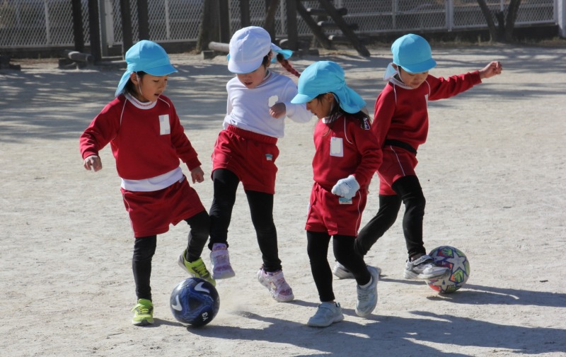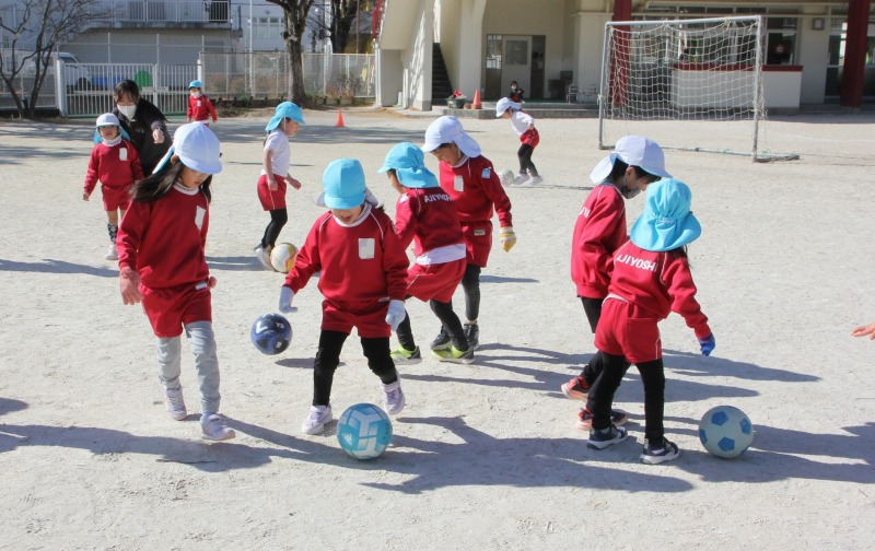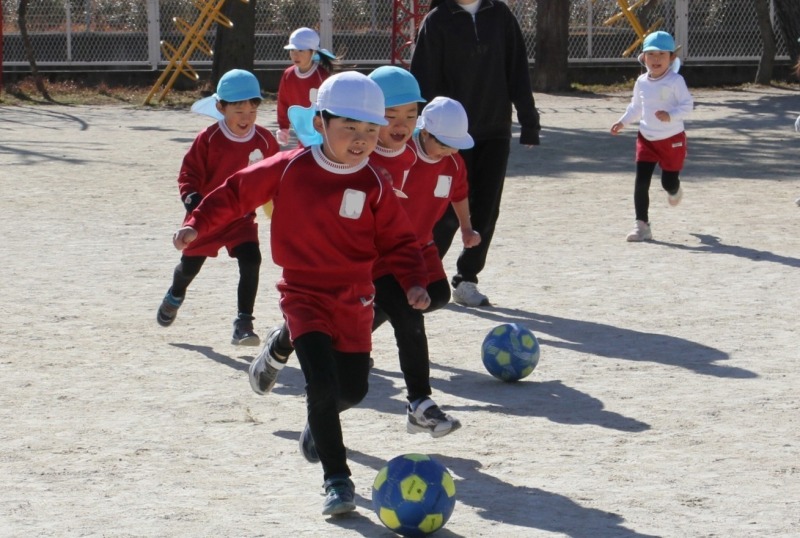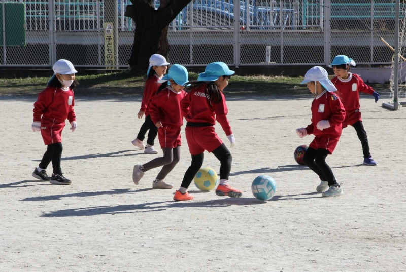 北風が冷たい日でしたが、みんなでサッカーを楽しみました。ドリブルでボール奪取ゲームをしたり、ゴールに向かってシュートにも挑戦しました。