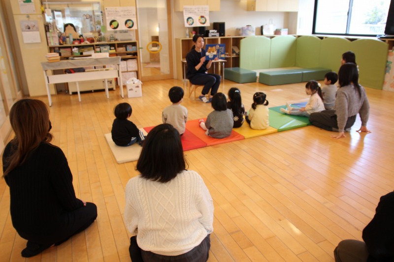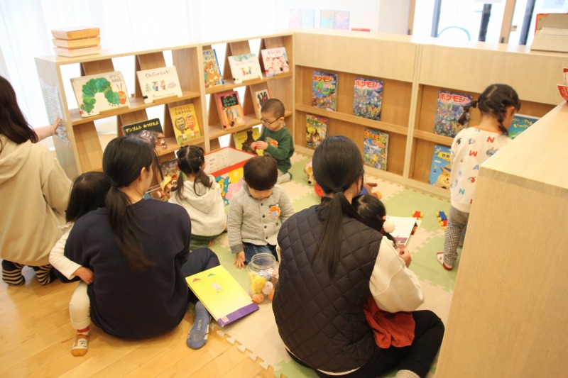 少しの時間お母さんと離れて、絵本コーナーで先生と一緒におままごとをしたり、おもちゃ遊びをして楽しく過ごしました。