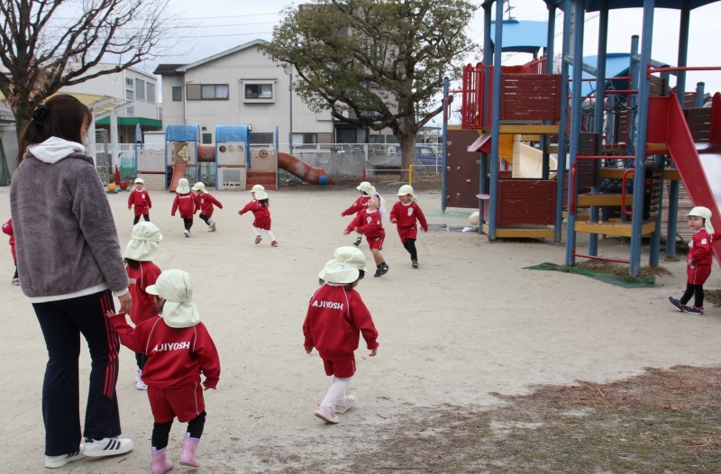 少しだけ積もっていた雪もすっかり解けてしまい雪遊びはできませんでしたが、戸外遊びをしました。