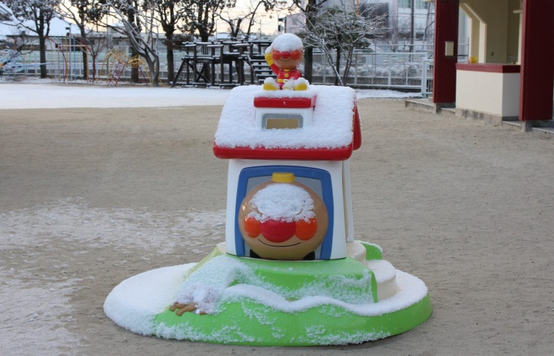 園庭にうっすら雪が積もり、登園した子どもたちは「ゆきがふった~!」と喜んでいました。アンパンマンもふわふわの雪の帽子をかぶっていました。