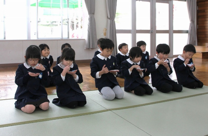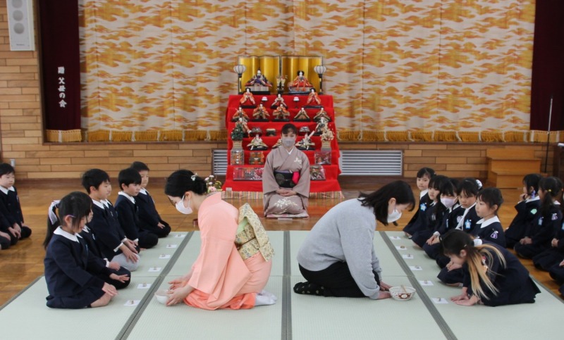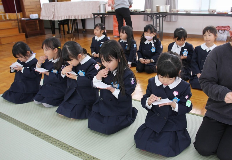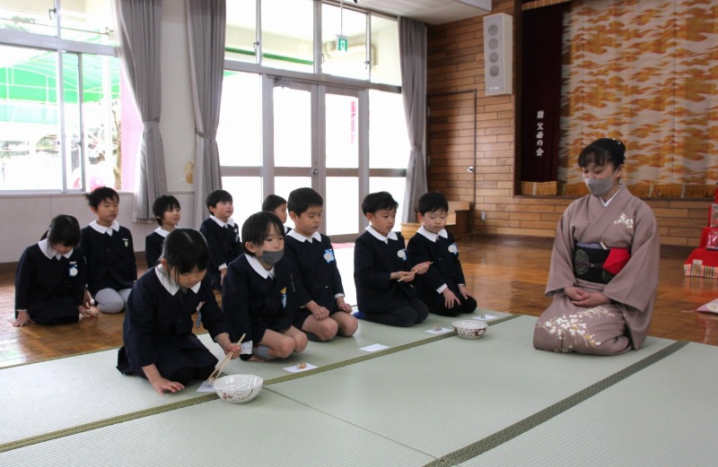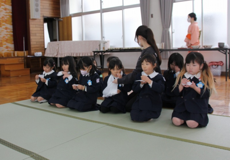 年長クラス最後のお作法教室を行いました。この1年お作法教室で畳の歩き方やお抹茶茶碗の扱い方、お抹茶の飲み方などの所作を学び、心穏やかに茶道の時間を過ごすことができました。今日はどのクラスも背筋がピンと伸び、自信をもって立派に所作することができました。「この1年間で1番上手に行うことができましたね。」と先生からたくさん褒めていただきました。