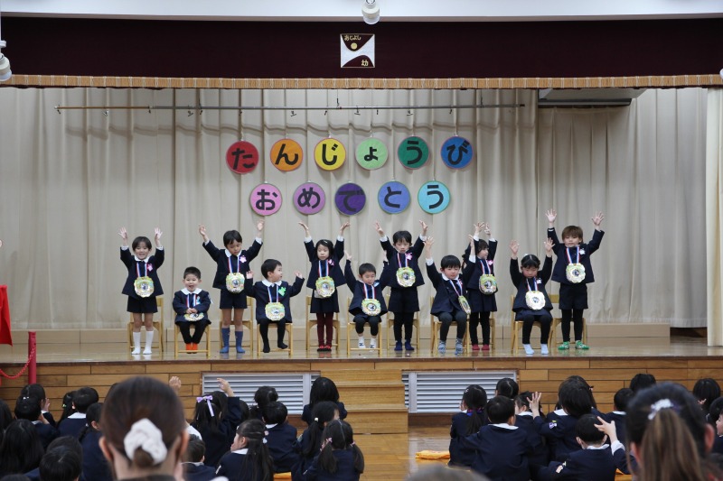3月生まれのお友だちのお祝いをしました。お誕生児さんは壇上で「大きくなったら何になりたいですか?」など、一人ずつ質問に答えることができました。